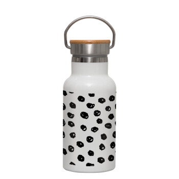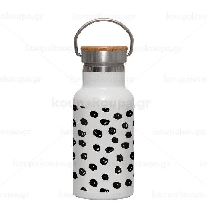 Doodle Dots, Μεταλλικό παγούρι θερμός (Stainless steel) Λευκό με ξύλινο καπακι (bamboo), διπλού τοιχώματος, 350ml