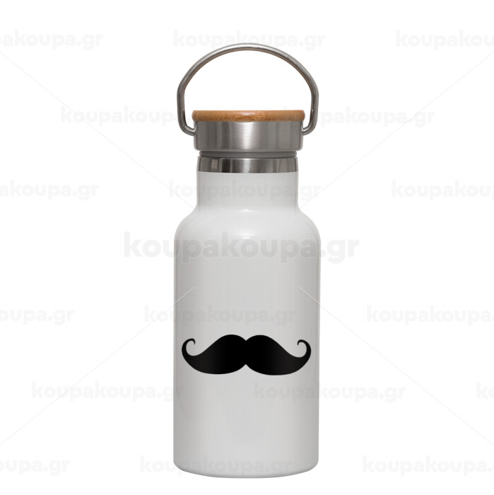Μουστάκι, Μεταλλικό παγούρι θερμός (Stainless steel) Λευκό με ξύλινο καπακι (bamboo), διπλού τοιχώματος, 350ml