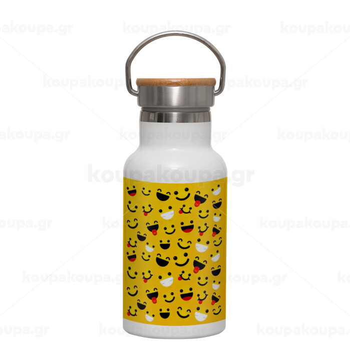 Smilies , Μεταλλικό παγούρι θερμός (Stainless steel) Λευκό με ξύλινο καπακι (bamboo), διπλού τοιχώματος, 350ml