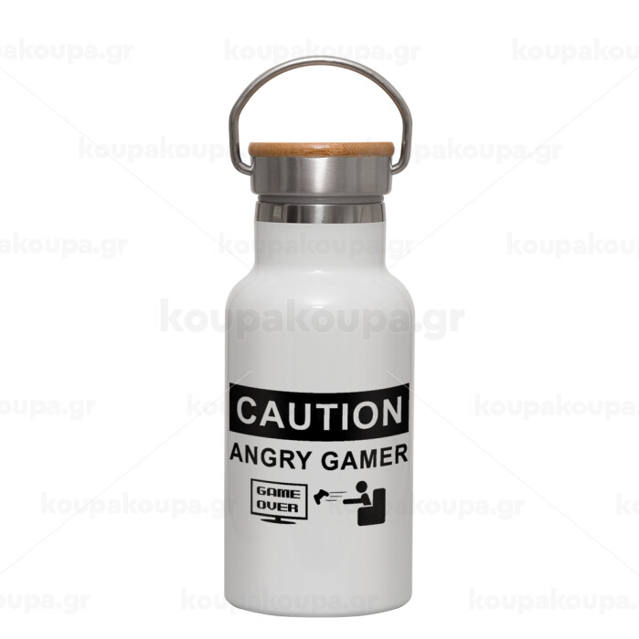 Caution, angry gamer!, Μεταλλικό παγούρι θερμός (Stainless steel) Λευκό με ξύλινο καπακι (bamboo), διπλού τοιχώματος, 350ml