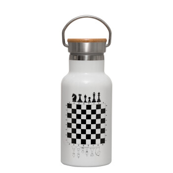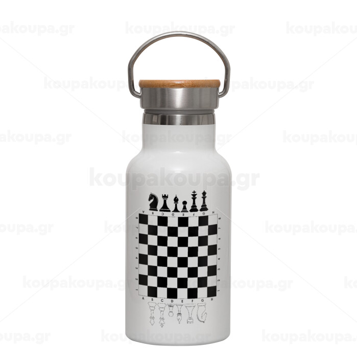 Σκάκι, Μεταλλικό παγούρι θερμός (Stainless steel) Λευκό με ξύλινο καπακι (bamboo), διπλού τοιχώματος, 350ml