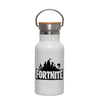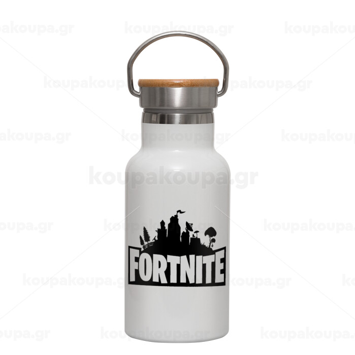 Fortnite, Μεταλλικό παγούρι θερμός (Stainless steel) Λευκό με ξύλινο καπακι (bamboo), διπλού τοιχώματος, 350ml