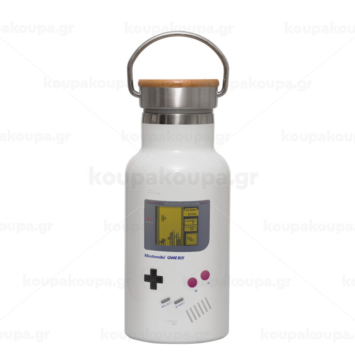 Gameboy, Μεταλλικό παγούρι θερμός (Stainless steel) Λευκό με ξύλινο καπακι (bamboo), διπλού τοιχώματος, 350ml