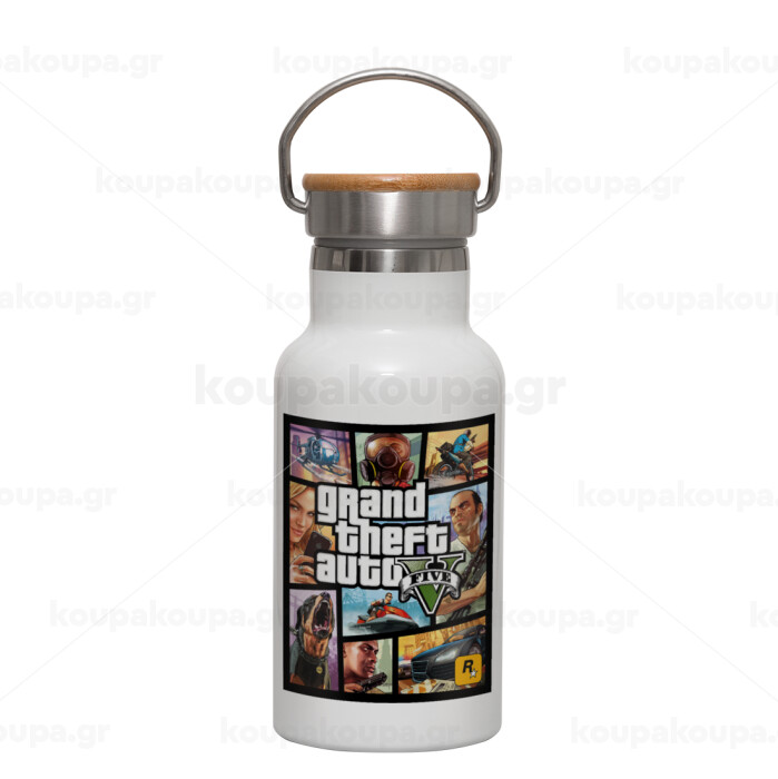GTA V, Μεταλλικό παγούρι θερμός (Stainless steel) Λευκό με ξύλινο καπακι (bamboo), διπλού τοιχώματος, 350ml