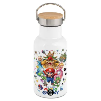 Mario Galaxy, Μεταλλικό παγούρι θερμός (Stainless steel) Λευκό με ξύλινο καπακι (bamboo), διπλού τοιχώματος, 350ml