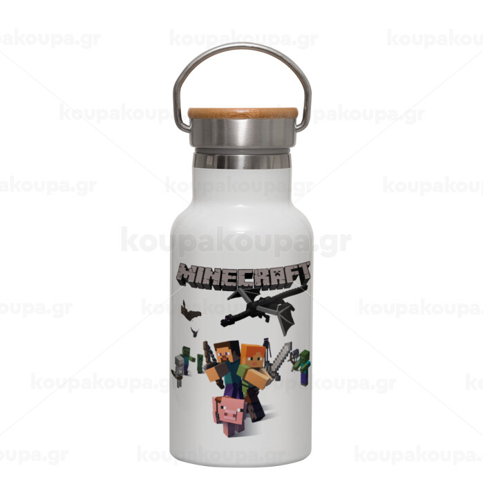 Minecraft Alex, Μεταλλικό παγούρι θερμός (Stainless steel) Λευκό με ξύλινο καπακι (bamboo), διπλού τοιχώματος, 350ml
