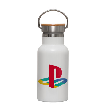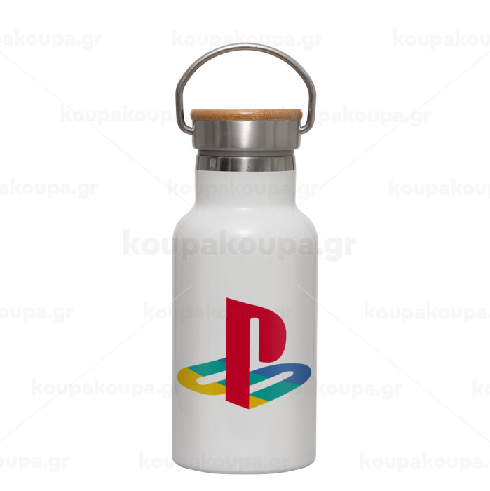 Playstation, Μεταλλικό παγούρι θερμός (Stainless steel) Λευκό με ξύλινο καπακι (bamboo), διπλού τοιχώματος, 350ml