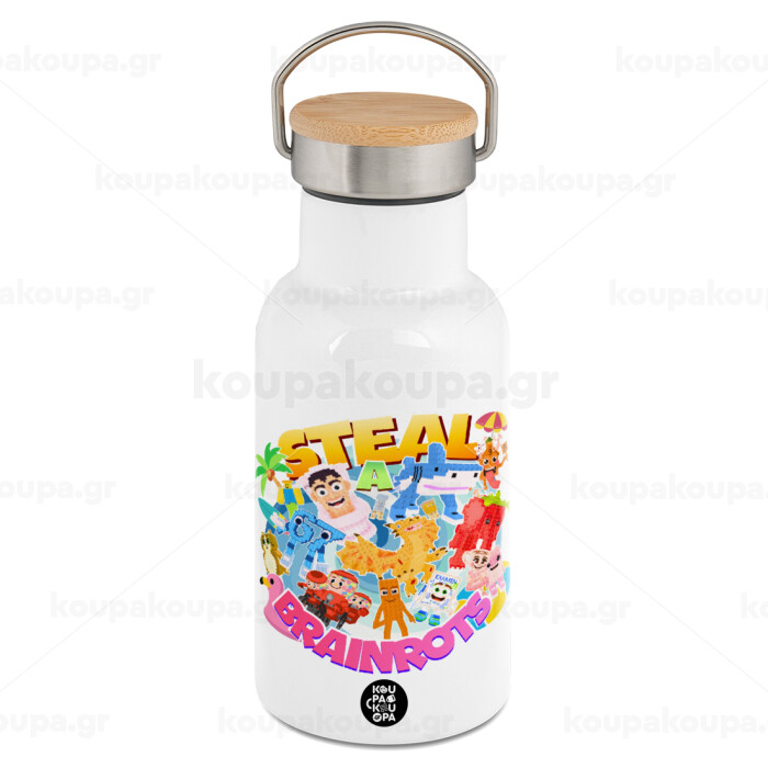 Roblox Steal a Brainrot, Μεταλλικό παγούρι θερμός (Stainless steel) Λευκό με ξύλινο καπακι (bamboo), διπλού τοιχώματος, 350ml