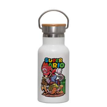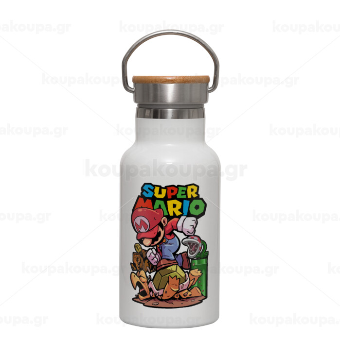 Super mario Jump, Μεταλλικό παγούρι θερμός (Stainless steel) Λευκό με ξύλινο καπακι (bamboo), διπλού τοιχώματος, 350ml