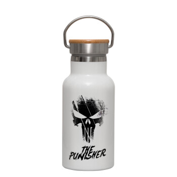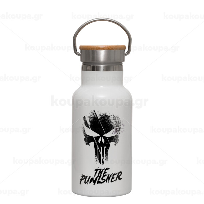 The punisher, Μεταλλικό παγούρι θερμός (Stainless steel) Λευκό με ξύλινο καπακι (bamboo), διπλού τοιχώματος, 350ml
