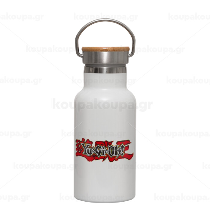 Yu-Gi-Oh, Μεταλλικό παγούρι θερμός (Stainless steel) Λευκό με ξύλινο καπακι (bamboo), διπλού τοιχώματος, 350ml
