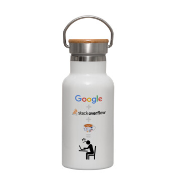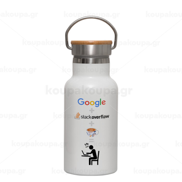 Google + Stack overflow + Coffee, Μεταλλικό παγούρι θερμός (Stainless steel) Λευκό με ξύλινο καπακι (bamboo), διπλού τοιχώματος, 350ml