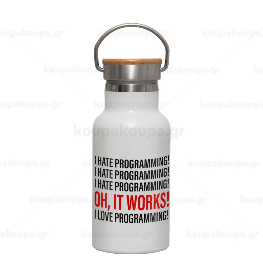 I hate programming!!!, Μεταλλικό παγούρι θερμός (Stainless steel) Λευκό με ξύλινο καπακι (bamboo), διπλού τοιχώματος, 350ml