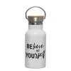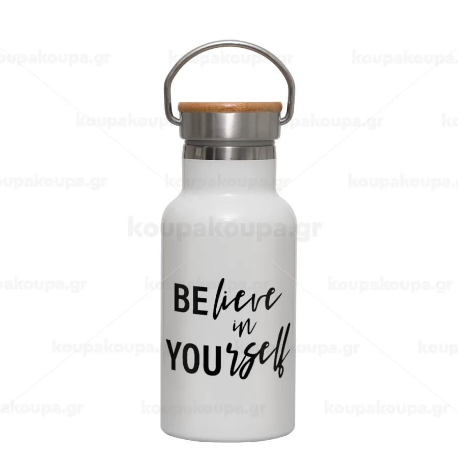 Believe in your self, Μεταλλικό παγούρι θερμός (Stainless steel) Λευκό με ξύλινο καπακι (bamboo), διπλού τοιχώματος, 350ml