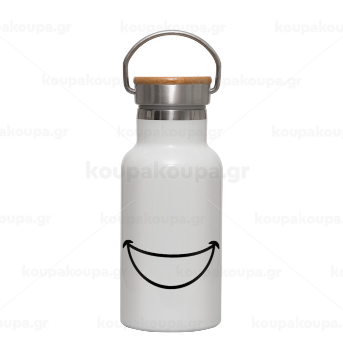 Χαμογέλα, Μεταλλικό παγούρι θερμός (Stainless steel) Λευκό με ξύλινο καπακι (bamboo), διπλού τοιχώματος, 350ml