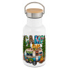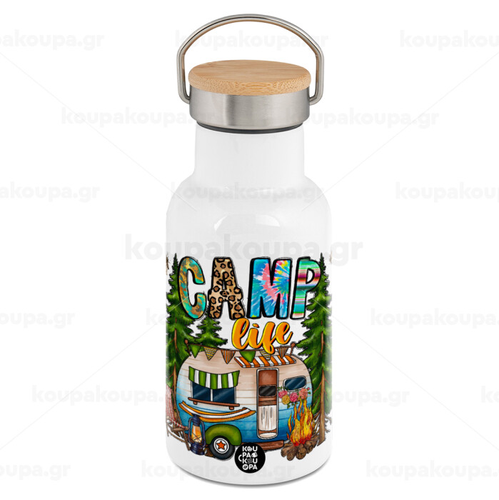 Camp Life, Μεταλλικό παγούρι θερμός (Stainless steel) Λευκό με ξύλινο καπακι (bamboo), διπλού τοιχώματος, 350ml