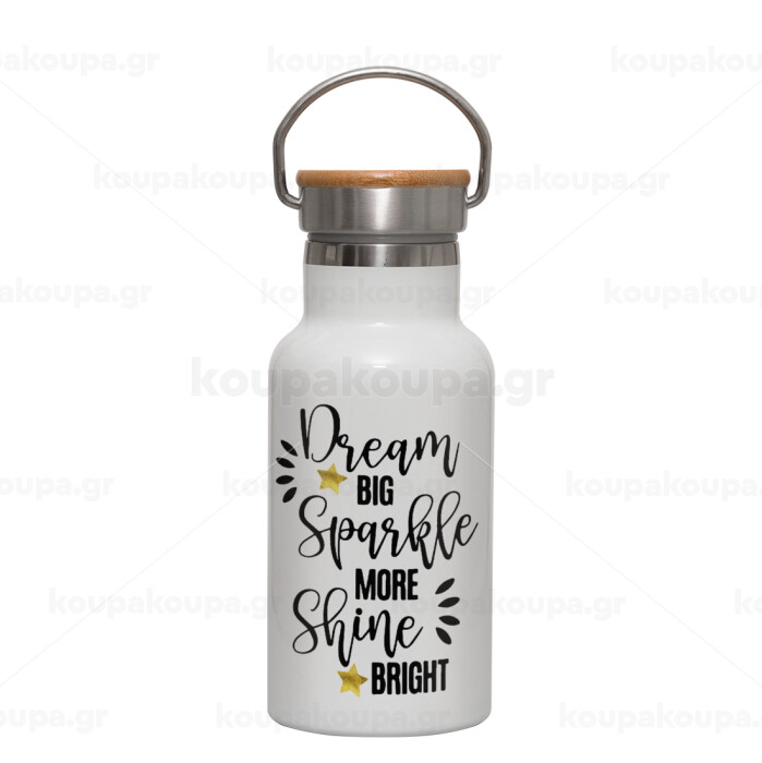 Dream big, Sparkle more, Shine bright, Μεταλλικό παγούρι θερμός (Stainless steel) Λευκό με ξύλινο καπακι (bamboo), διπλού τοιχώματος, 350ml