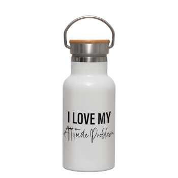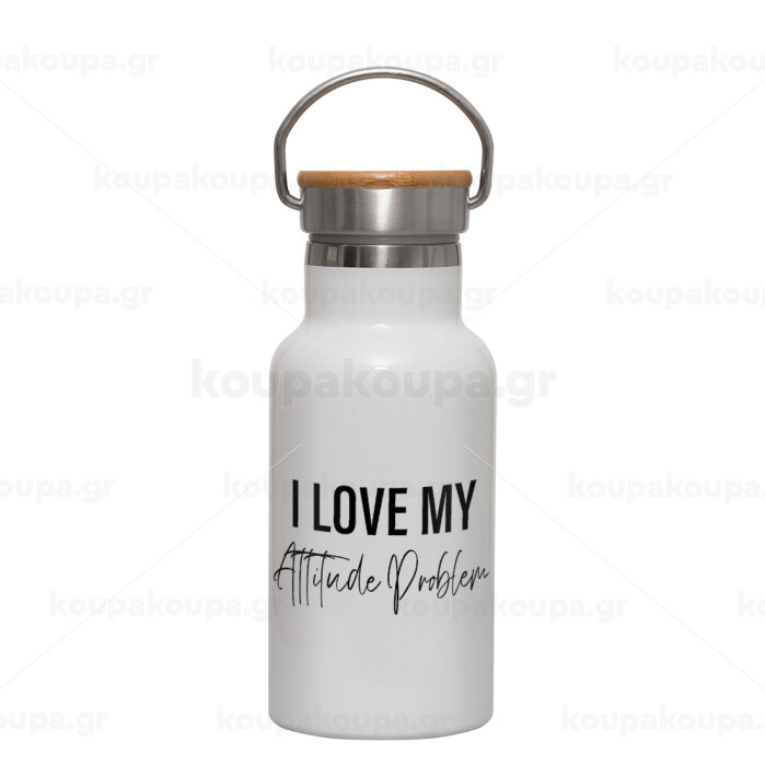 I love my attitude problem, Μεταλλικό παγούρι θερμός (Stainless steel) Λευκό με ξύλινο καπακι (bamboo), διπλού τοιχώματος, 350ml