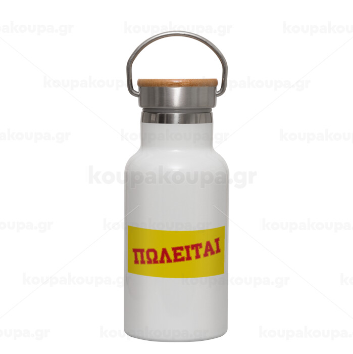ΠΩΛΕΙΤΑΙ, Μεταλλικό παγούρι θερμός (Stainless steel) Λευκό με ξύλινο καπακι (bamboo), διπλού τοιχώματος, 350ml