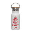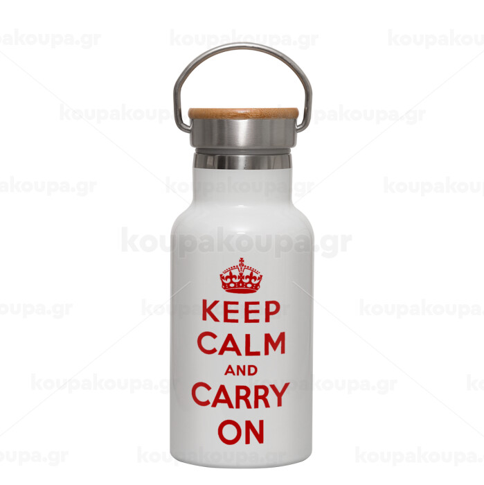 KEEP CALM  and carry on, Μεταλλικό παγούρι θερμός (Stainless steel) Λευκό με ξύλινο καπακι (bamboo), διπλού τοιχώματος, 350ml