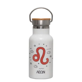 Ζώδια Λέων, Μεταλλικό παγούρι θερμός (Stainless steel) Λευκό με ξύλινο καπακι (bamboo), διπλού τοιχώματος, 350ml