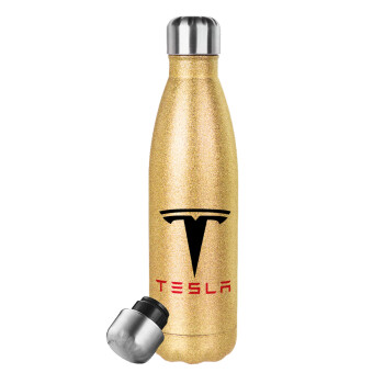 Tesla motors, Μεταλλικό παγούρι θερμός Glitter χρυσό (Stainless steel), διπλού τοιχώματος, 500ml