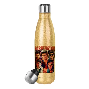 Steve Harrington, Stranger Things, Μεταλλικό παγούρι θερμός Glitter χρυσό (Stainless steel), διπλού τοιχώματος, 500ml