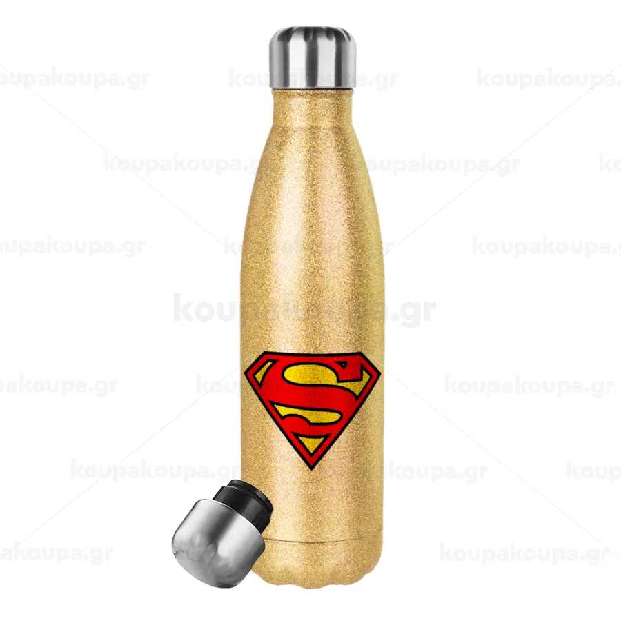 Superman vintage, Μεταλλικό παγούρι θερμός Glitter χρυσό (Stainless steel), διπλού τοιχώματος, 500ml