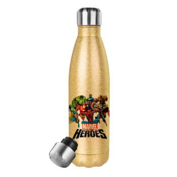MARVEL heroes, Μεταλλικό παγούρι θερμός Glitter χρυσό (Stainless steel), διπλού τοιχώματος, 500ml
