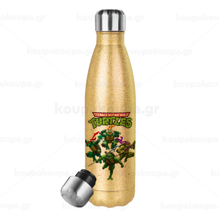 Ninja turtles, Μεταλλικό παγούρι θερμός Glitter χρυσό (Stainless steel), διπλού τοιχώματος, 500ml