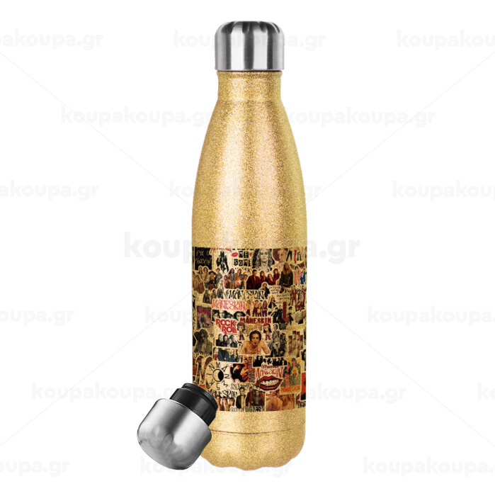 Maneskin stickers, Μεταλλικό παγούρι θερμός Glitter χρυσό (Stainless steel), διπλού τοιχώματος, 500ml