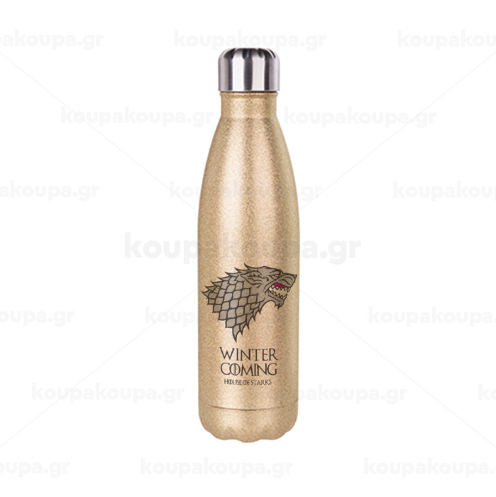 GOT House of Starks, winter coming, Μεταλλικό παγούρι θερμός Glitter χρυσό (Stainless steel), διπλού τοιχώματος, 500ml