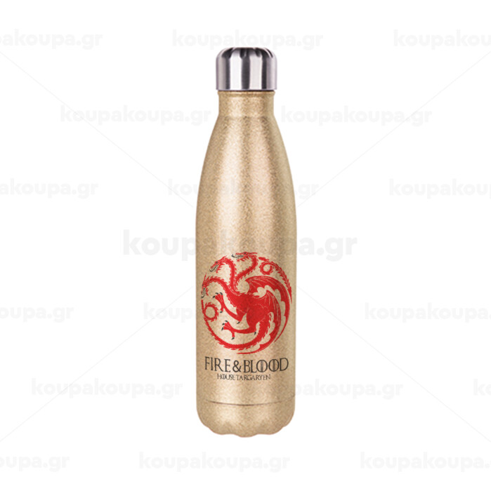 GOT House Targaryen, Fire Blood, Μεταλλικό παγούρι θερμός Glitter χρυσό (Stainless steel), διπλού τοιχώματος, 500ml