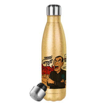 Μπαρτζό, Ποιος? Αυτός!!! 1-0, Μεταλλικό παγούρι θερμός Glitter χρυσό (Stainless steel), διπλού τοιχώματος, 500ml