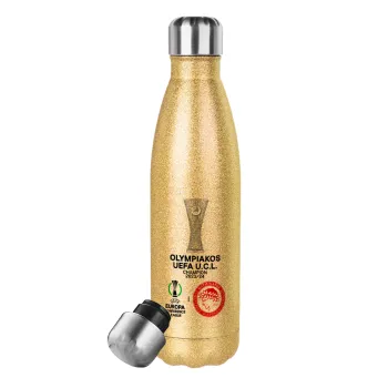 Ολυμπιακός νικητής UEFA Europa Conference League Champion 2023/24, Μεταλλικό παγούρι θερμός Glitter χρυσό (Stainless steel), διπλού τοιχώματος, 500ml