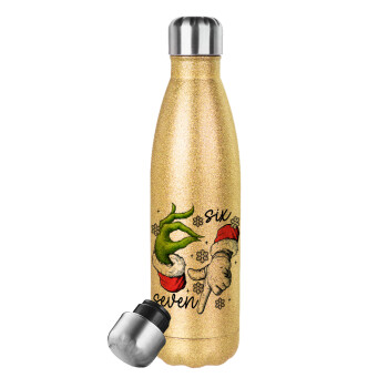 Christmas Meme SIX SEVEN (67), Μεταλλικό παγούρι θερμός Glitter χρυσό (Stainless steel), διπλού τοιχώματος, 500ml