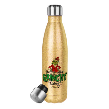 Grinch Feeling Extra Grinchy Today, Μεταλλικό παγούρι θερμός Glitter χρυσό (Stainless steel), διπλού τοιχώματος, 500ml