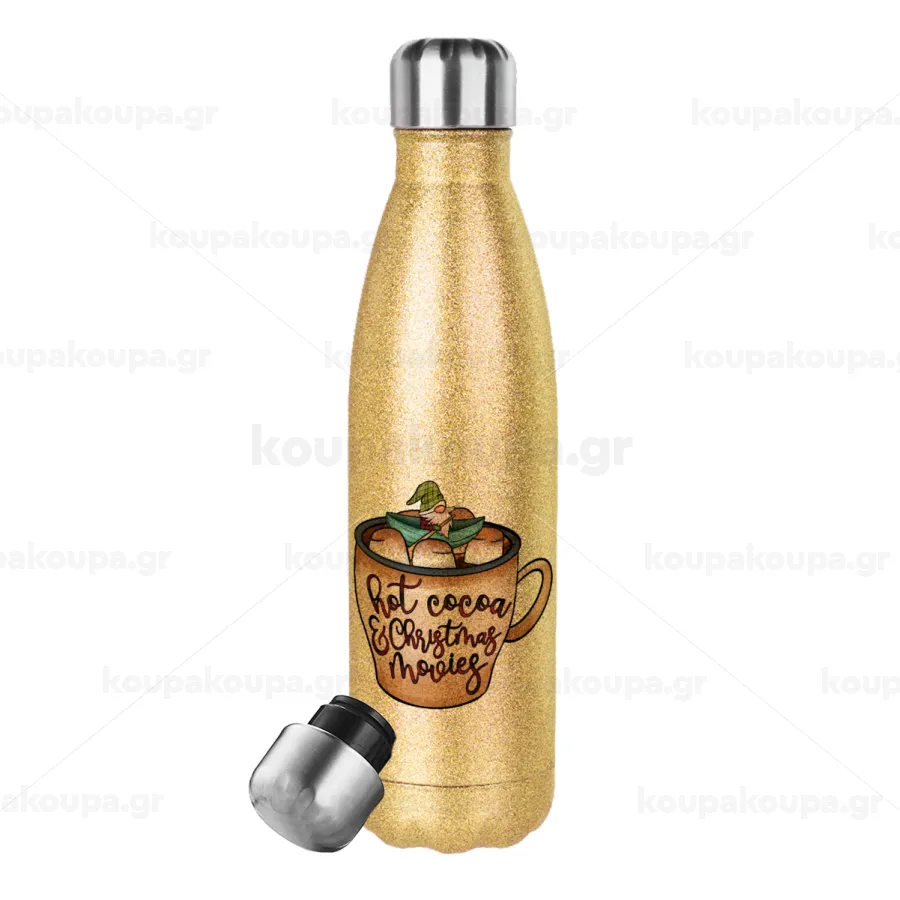 Hot Cocoa And Christmas Movies, Μεταλλικό παγούρι θερμός Glitter χρυσό (Stainless steel), διπλού τοιχώματος, 500ml
