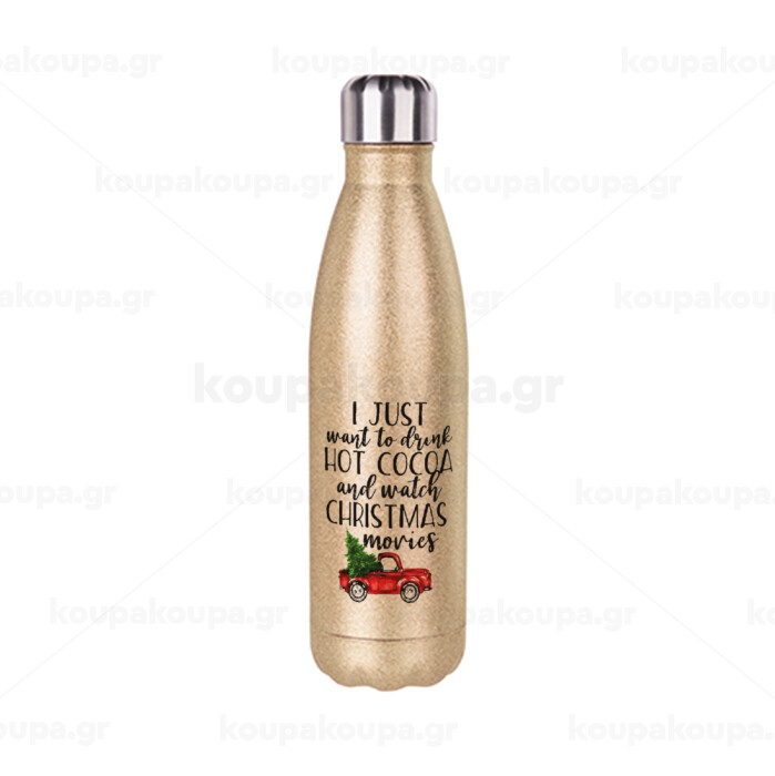I just want to drink hot cocoa and watch christmas movies pickup car, Μεταλλικό παγούρι θερμός Glitter χρυσό (Stainless steel), διπλού τοιχώματος, 500ml
