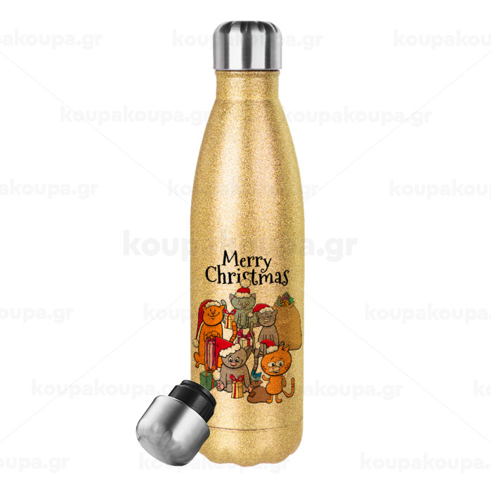 Merry Christmas Cats, Μεταλλικό παγούρι θερμός Glitter χρυσό (Stainless steel), διπλού τοιχώματος, 500ml