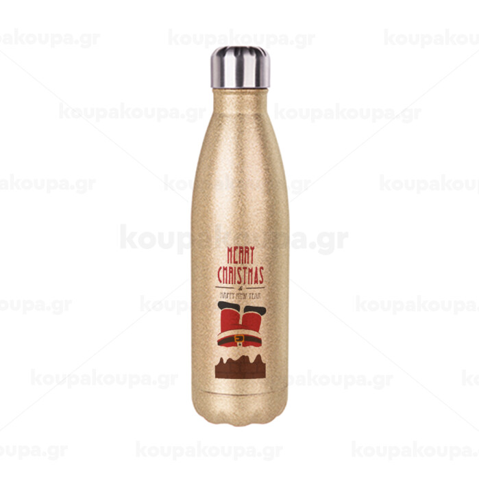 Merry christmas chimney, Μεταλλικό παγούρι θερμός Glitter χρυσό (Stainless steel), διπλού τοιχώματος, 500ml