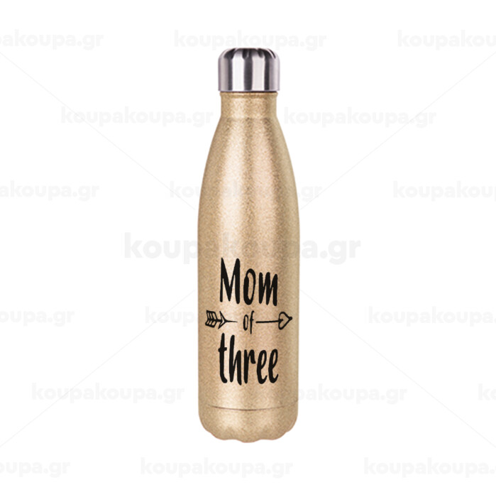 Mom of three, Μεταλλικό παγούρι θερμός Glitter χρυσό (Stainless steel), διπλού τοιχώματος, 500ml