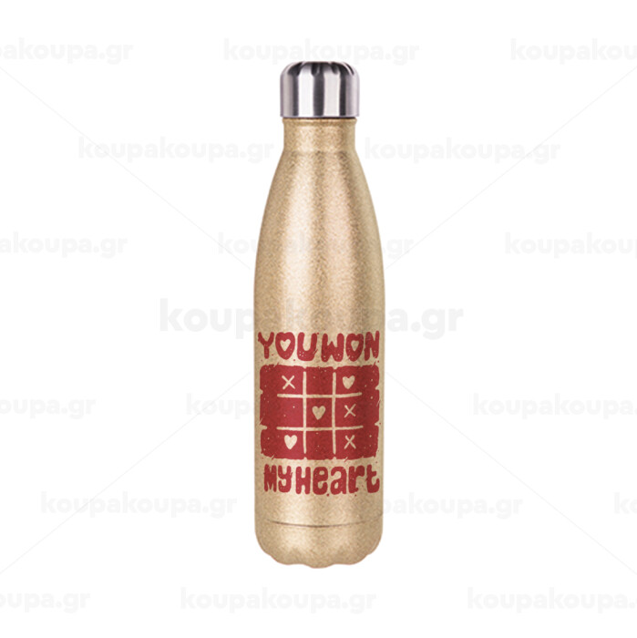 Τρίλιζα you won my heart, Μεταλλικό παγούρι θερμός Glitter χρυσό (Stainless steel), διπλού τοιχώματος, 500ml