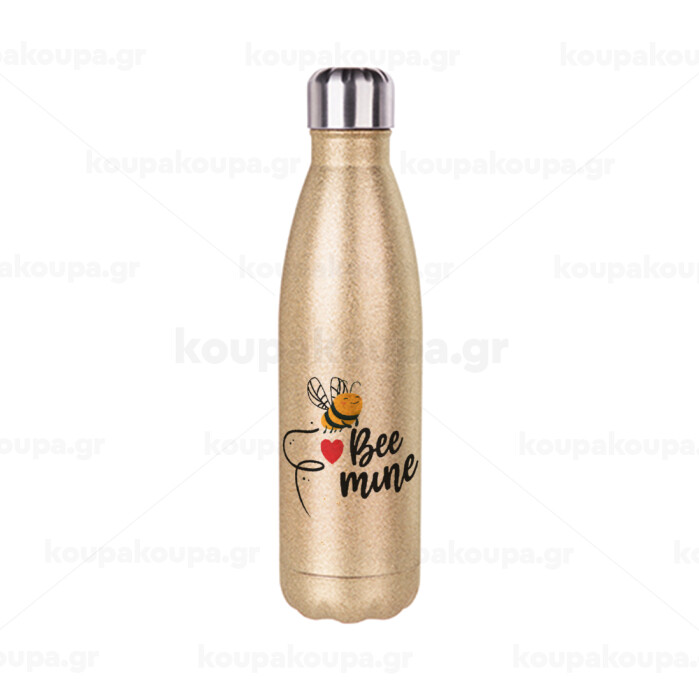 Bee mine!!!, Μεταλλικό παγούρι θερμός Glitter χρυσό (Stainless steel), διπλού τοιχώματος, 500ml