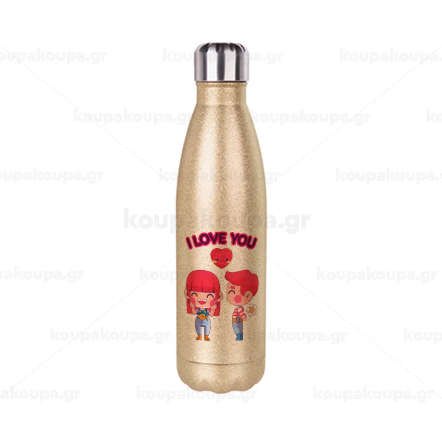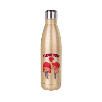 Couple, I love you, Μεταλλικό παγούρι θερμός Glitter χρυσό (Stainless steel), διπλού τοιχώματος, 500ml
