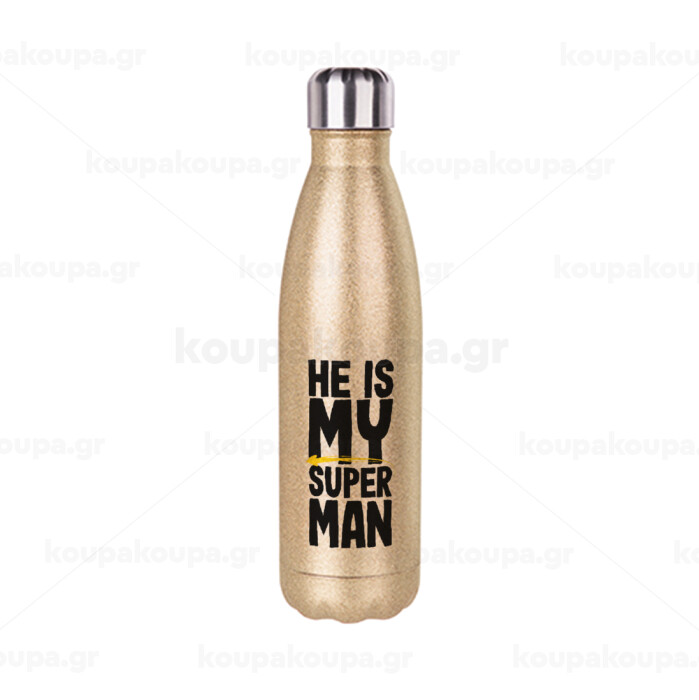 He is my superman, Μεταλλικό παγούρι θερμός Glitter χρυσό (Stainless steel), διπλού τοιχώματος, 500ml