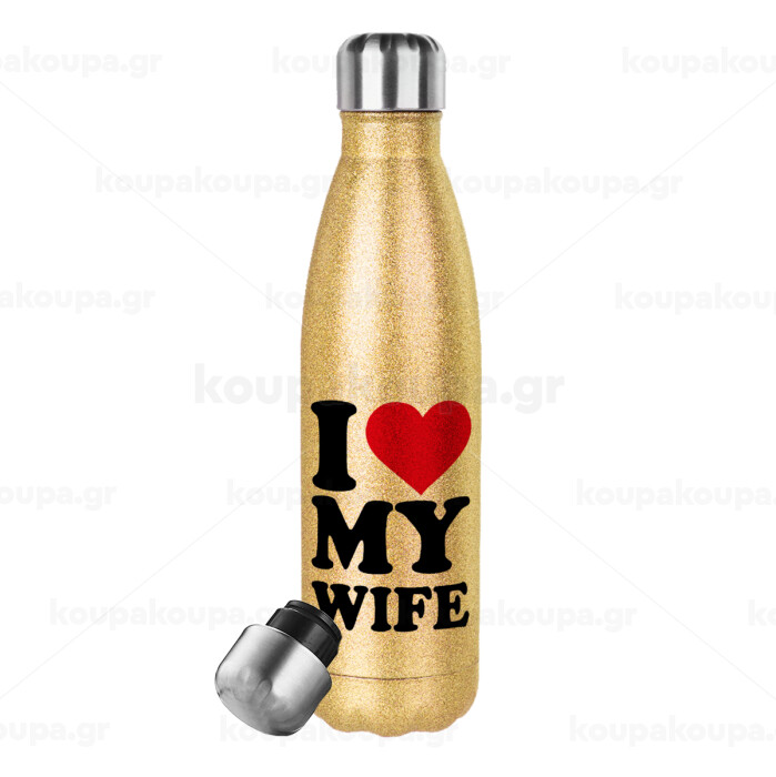I Love my Wife, Μεταλλικό παγούρι θερμός Glitter χρυσό (Stainless steel), διπλού τοιχώματος, 500ml