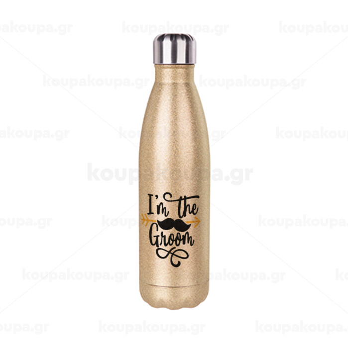 I'm the groom mustache, Μεταλλικό παγούρι θερμός Glitter χρυσό (Stainless steel), διπλού τοιχώματος, 500ml