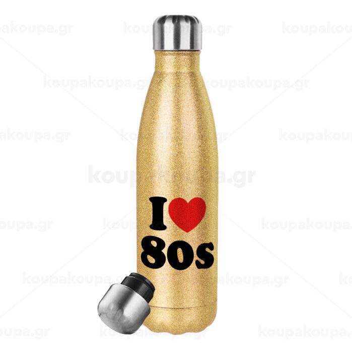 I Love 80s, Μεταλλικό παγούρι θερμός Glitter χρυσό (Stainless steel), διπλού τοιχώματος, 500ml