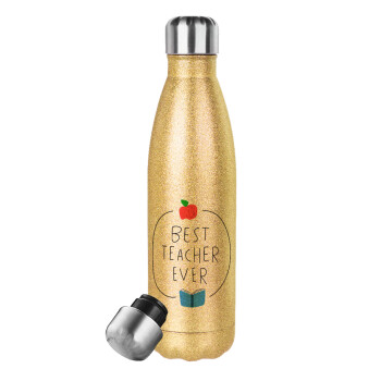 Best teacher ever, Μεταλλικό παγούρι θερμός Glitter χρυσό (Stainless steel), διπλού τοιχώματος, 500ml